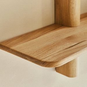 Le scaffalature Kipli sono realizzate in legno massello naturale senza truciolato né resina chimica, con finiture a base di oli vegetali o vernici naturali incolori.